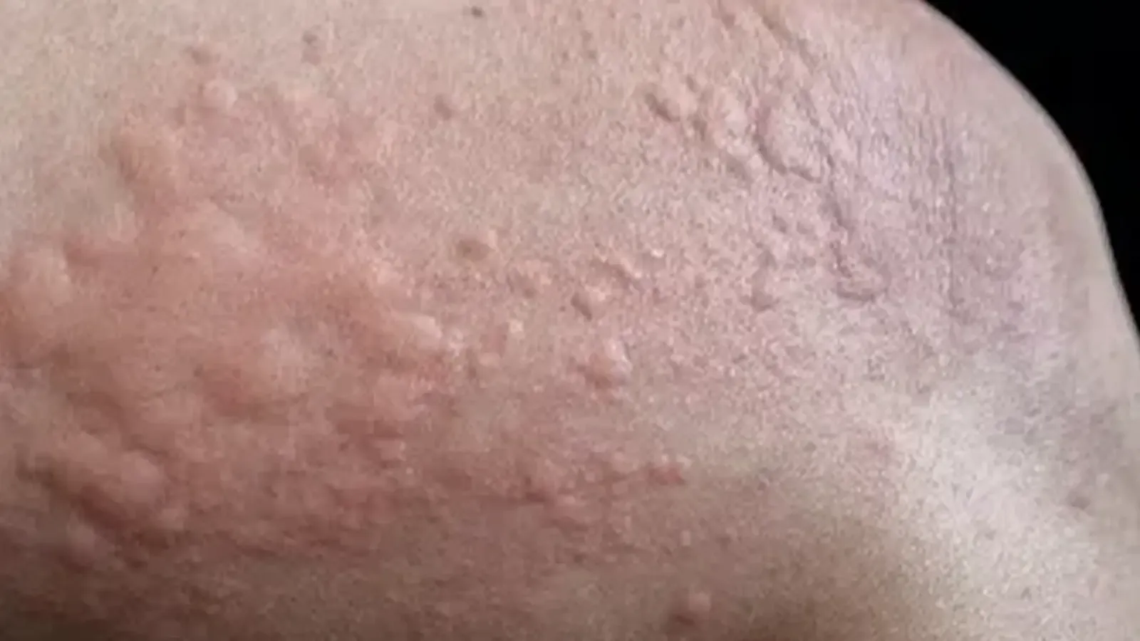 - Raised, red, or skin-coloured welts that may merge into larger patches